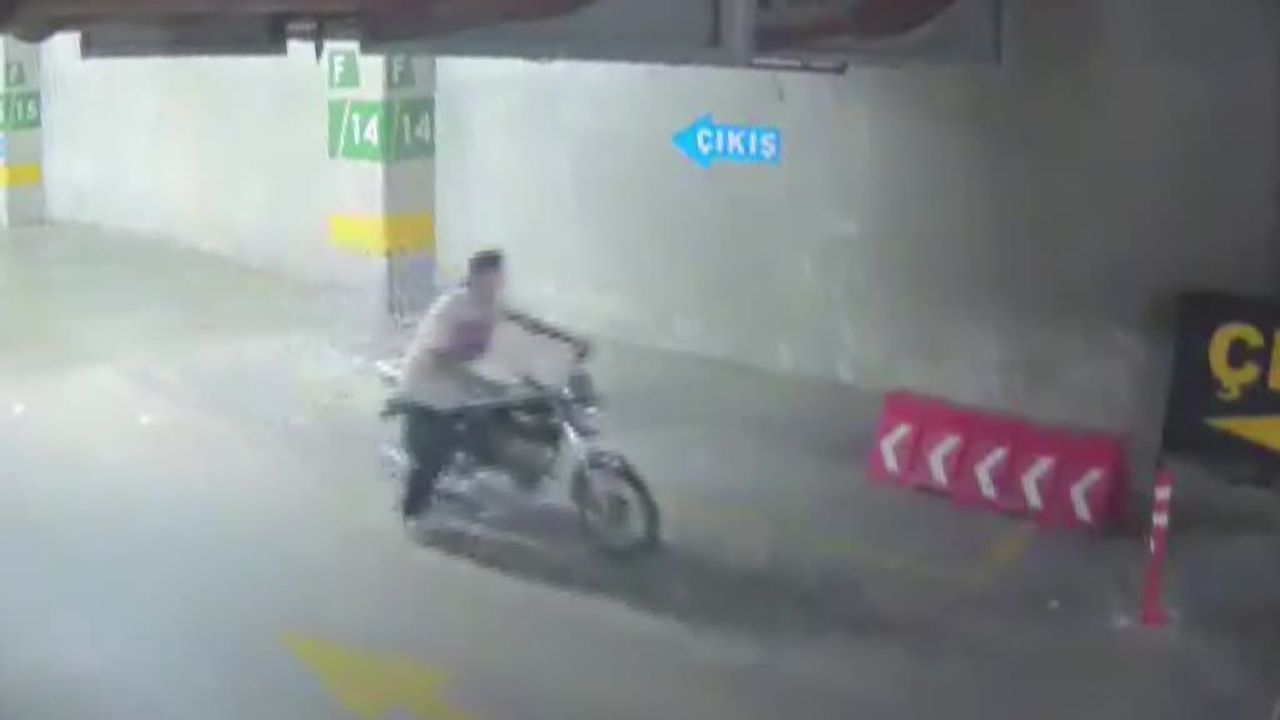 Hastanenin güvenlik kamerası görüntülerine göre, zanlı, otoparktaki bir motosikleti itekleyerek götürüyor.