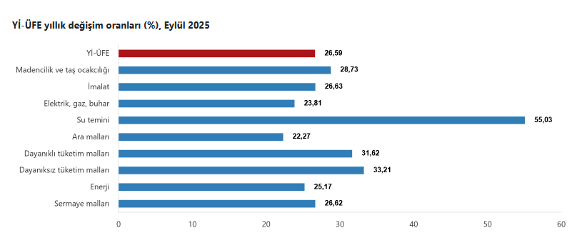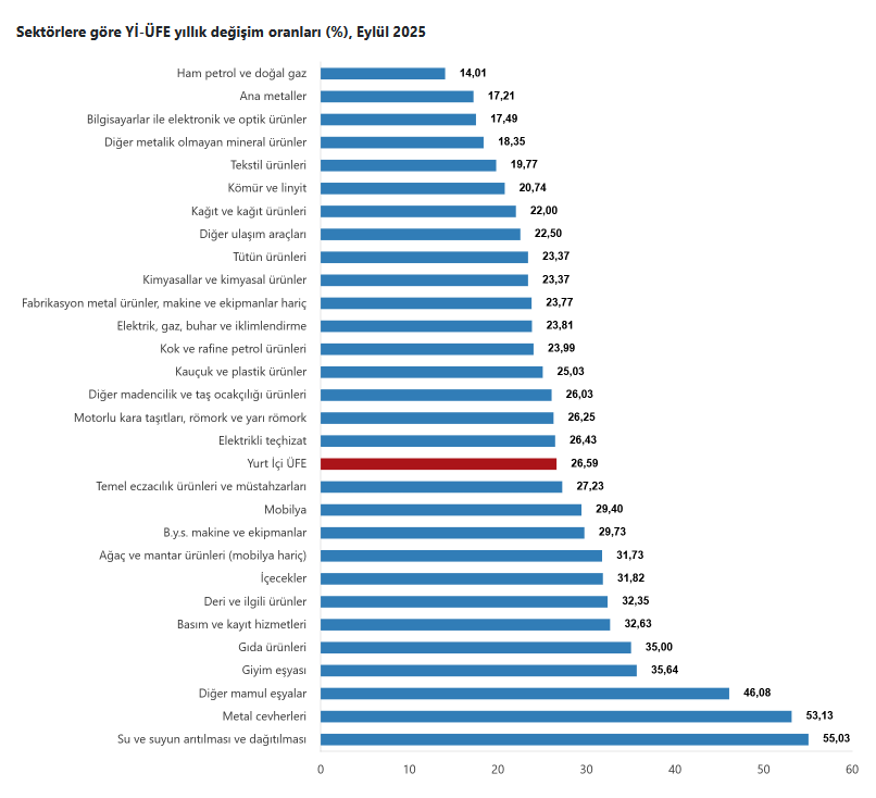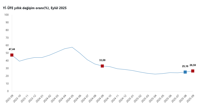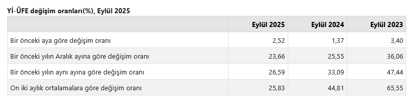 Türkiye İstatistik Kurumu (TÜİK) verilerine göre, Yİ-ÜFE (2003=100) 2025 yılı Eylül ayında bir önceki aya göre yüzde 2,52 artış, bir önceki yılın Aralık ayına göre yüzde 23,66 artış, bir önceki yılın aynı ayına göre yüzde 26,59 artış ve on iki aylık ortalamalara göre yüzde 25,83 artış gösterdi.